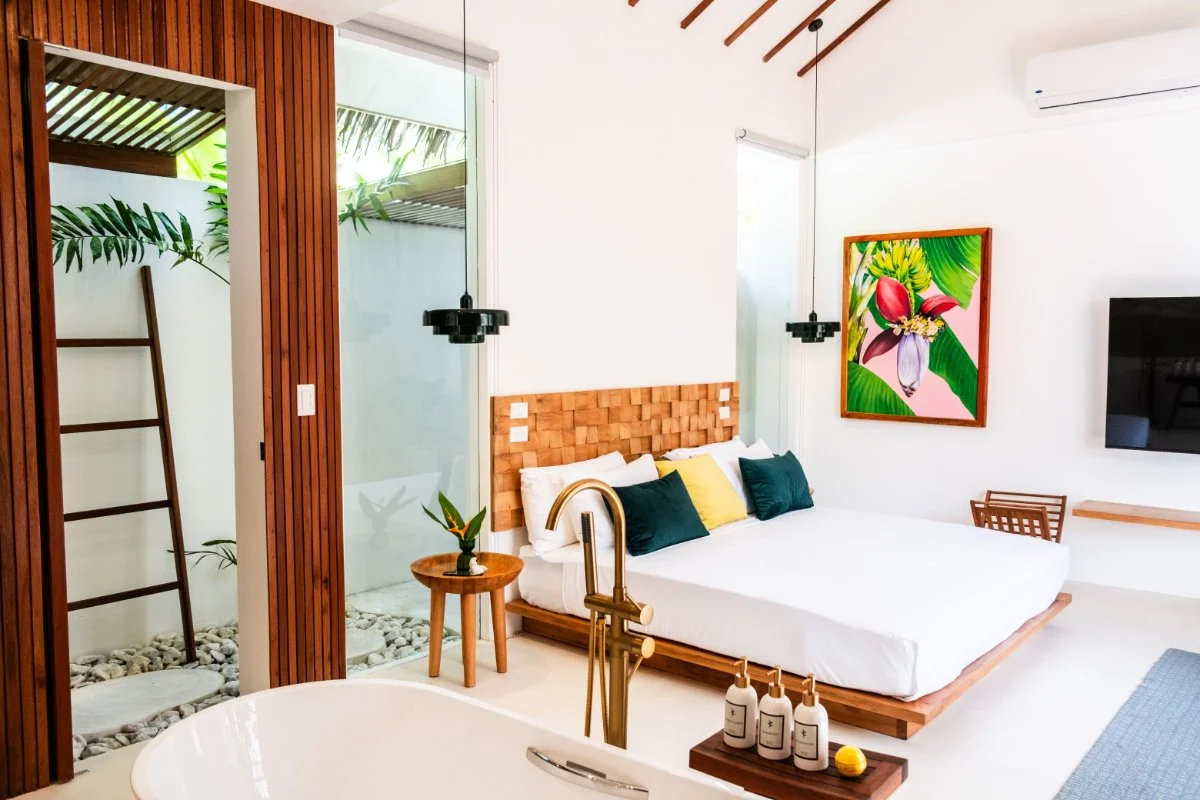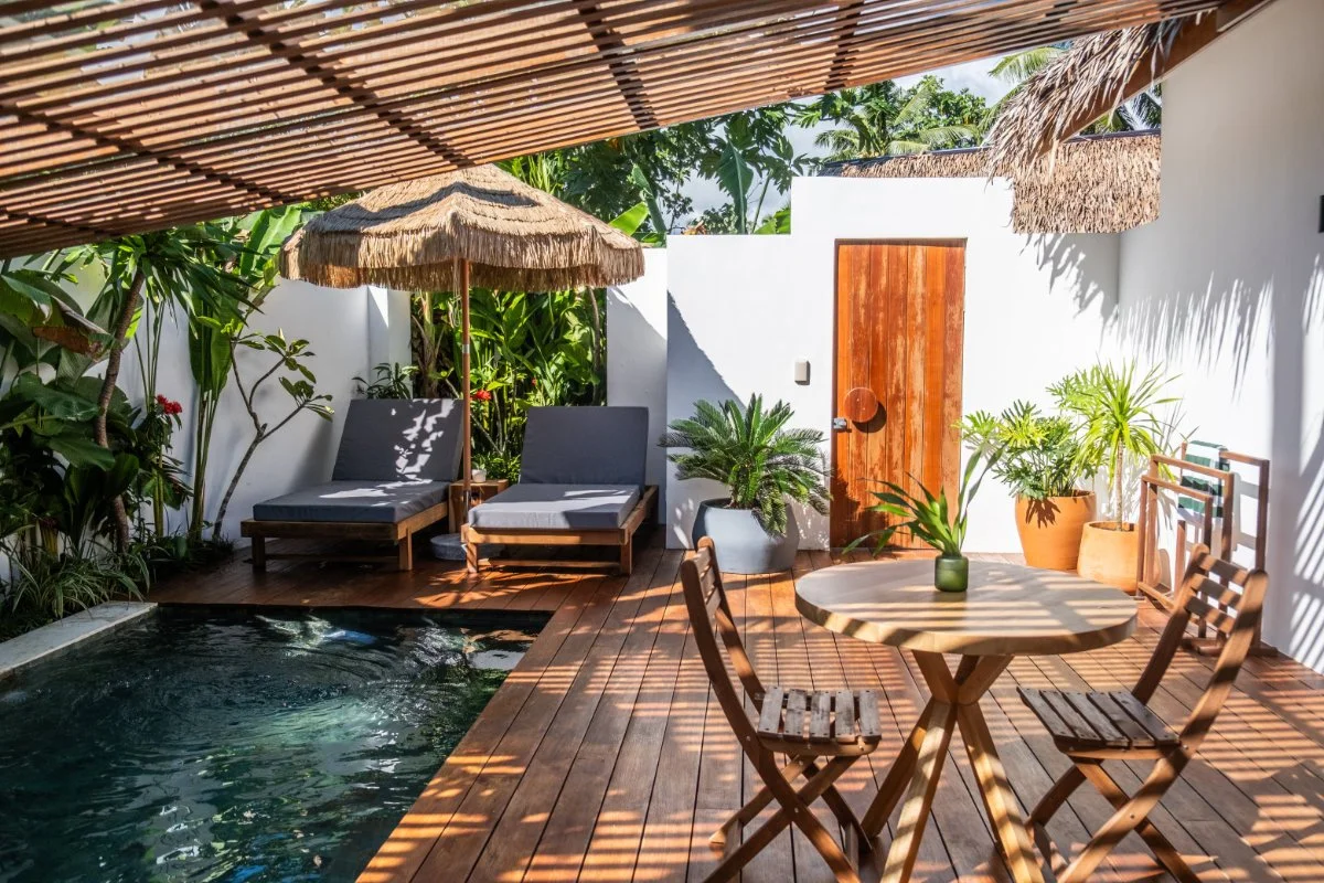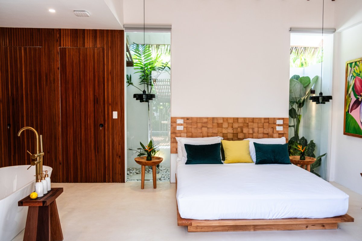 Our stunning private villas are located near one of the most beautiful beaches of Siargao. Enjoy the scenic private outdoor pool views & stylishly furnished spacious indoor with a touch of local art. All just a few steps away from the beautiful sandy beach. The unique mixture of modern design & tropical nature provides comfort and privacy whilst offering unique experience of luxurious getaway in a jungle paradise.