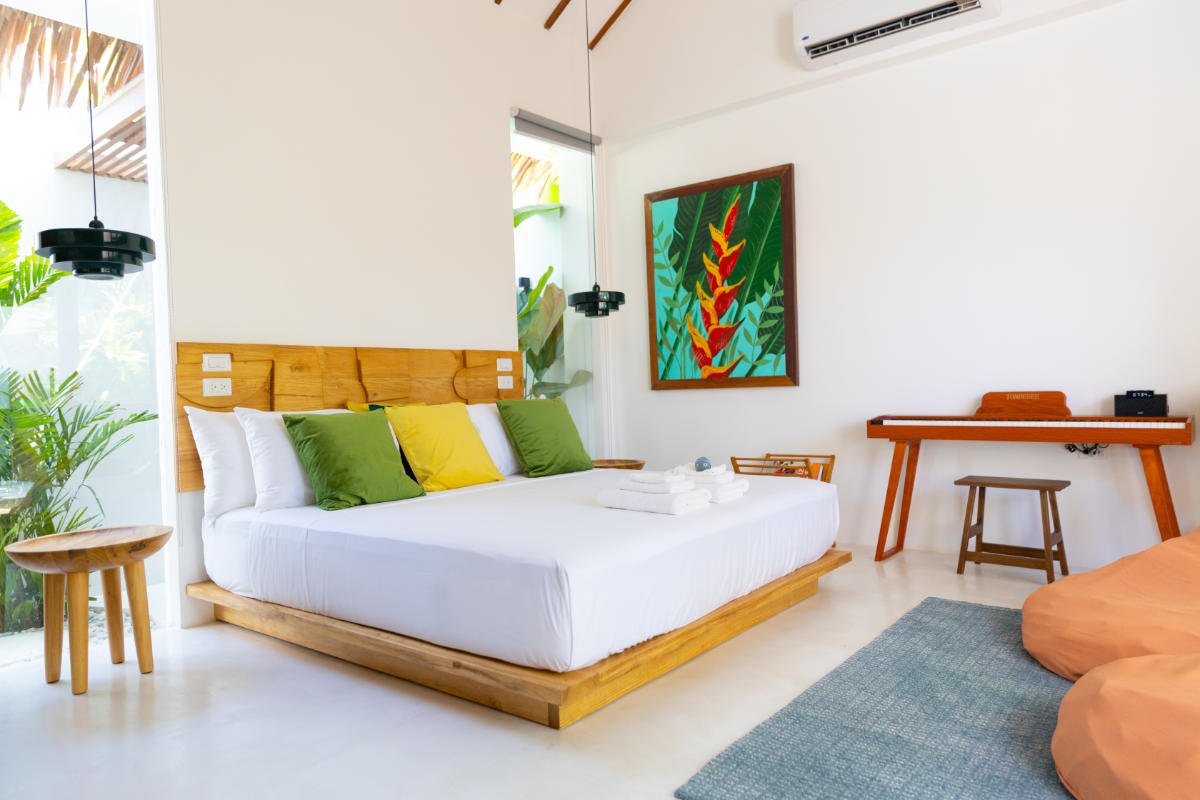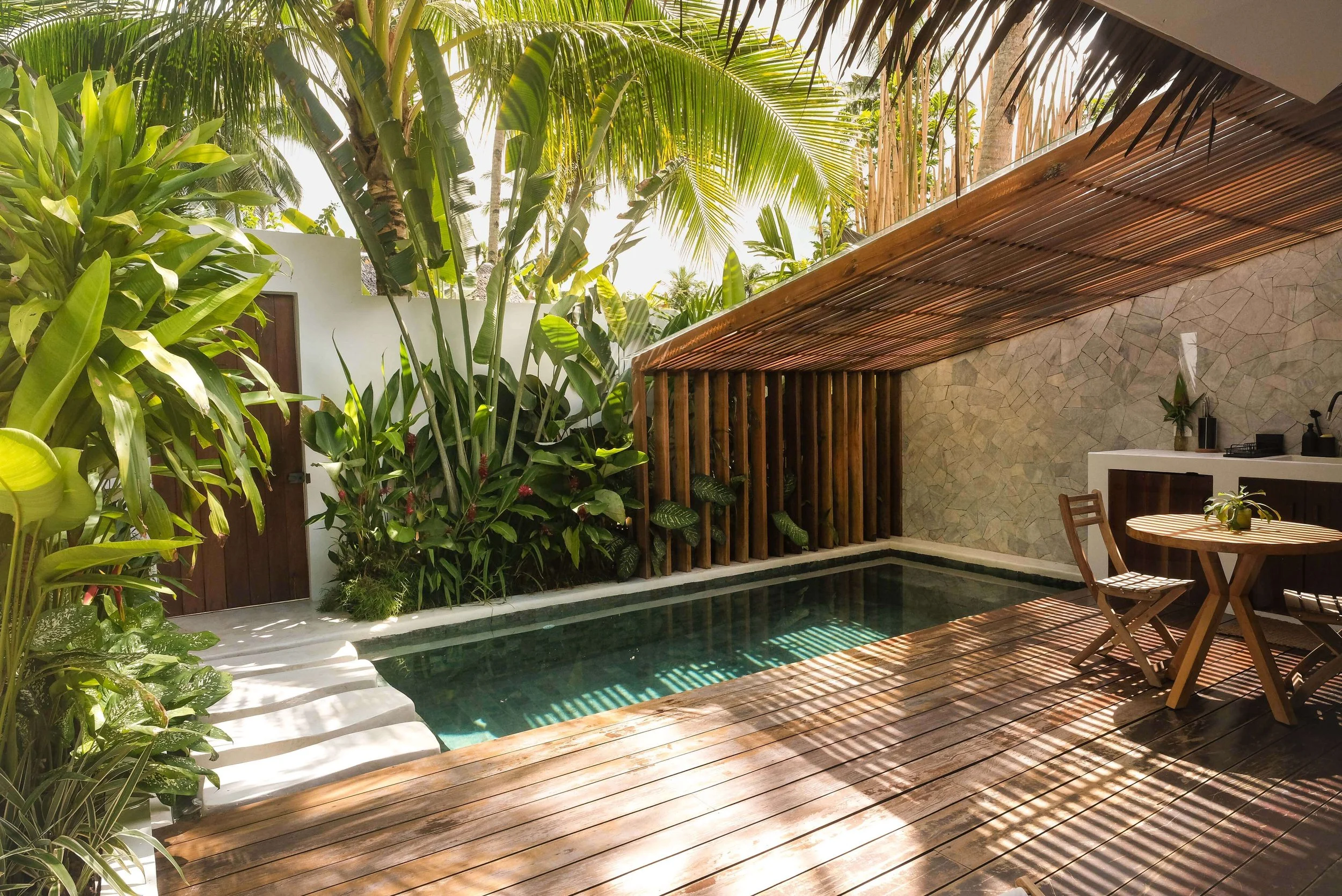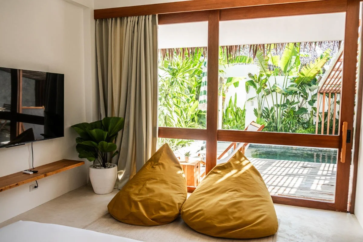 Our stunning private villas are located near one of the most beautiful beaches of Siargao. Enjoy the scenic private outdoor pool views & stylishly furnished spacious indoor with a touch of local art. All just a few steps away from the beautiful sandy beach. The unique mixture of modern design & tropical nature provides comfort and privacy whilst offering unique experience of luxurious getaway in a jungle paradise.
